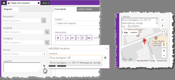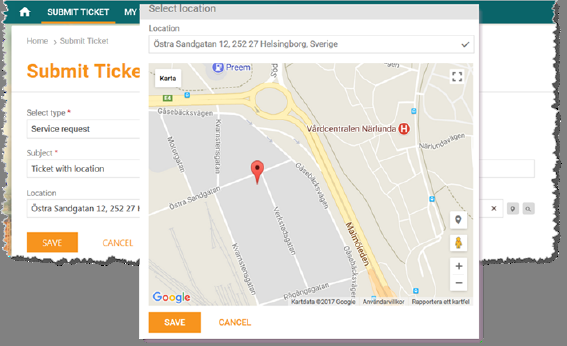 It is possible to input locations on Tickets and Users. The System administrators has to activate this for Ticketswhere it can be used to pinpoint the location of the problem that evoked the creation of the Ticket. Home office is the natural use when adding it to Users. The system uses Google maps to find addresses and when an address is used for the first time it is stored in the system database.