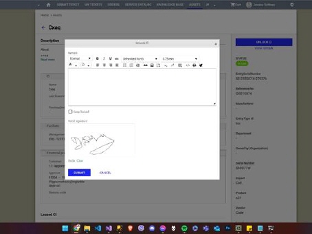 On the Agent portal, unlocking the CI is performed in the same manner as the lock with the addition of the hand signature. The remark will be available in the detail grid in the Entity Locks History section (from the CI grid menu).