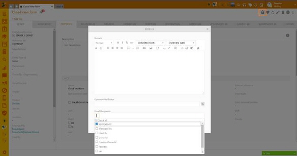 Click on the padlock icon opens a pop-up giving you options to leave a remark, i.e. explain why the CI is being locked, a field where you set the CI Verifier – a user who should verify/validate this CI and a dropdown list of users to choose from, who will then receive a notification that the CI was locked.