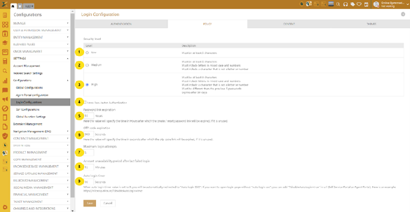 Besides the password security level, you can set duration in hours when unused password link expires, maximum login attempts and unavailability period after failed login.