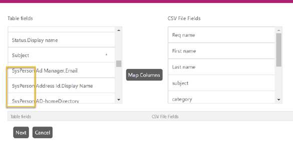 When you click Next button after entering all the details in Import Entities form, the next form Map Fields will be displayed where you map the fields of a CSV file with the fields of an entity: