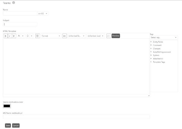 The following figure shows the Teams Template form. This form contains the basic fields that are necessary to create the template like Name, Subject, HTML template, Teams notification color and MS Teams Webhook url.