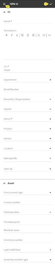 By tapping the Add CI in the CMDB Main Page, you will get the popup where you first have to select CI Type. When the CI Type is selected, appropriate form for this type will be invoked. Example of a form (Asset type) is shown in the picture. Fields in the form are grouped based on the
