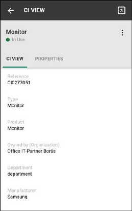 CI details page displays information of the selected CI. CI details page contains two tabs: CI View and Properties. For both tabs a general part is displayed at the top of the page containing general information about CI: Name and Status. Status is a dropdown where you can select a new status. This part also contains options menu in the top right corner. This menu has Refresh, Edit and Duplicate options: •Refresh is used for reload data in the page. •Edit opens form where you can edit CI data. Fields