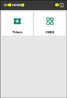 In Home page and in all other pages, except when form is displayed, application header contains Main Menu (1), header of current location in the application (2) and Tabs link (3) which display number of opened tabs. Home page is displayed after successful login. This is the prime interface for agents. From here you can browse the application. Home page contains Tickets and CMDB selections: Tickets – Tap this button to access the Ticket main page. CMDB – Tap to access the CMDB main page. Tab link You can always tap the Tab link in upper right corner to see a list of currently opened tabs. Number of open tabs are shown in the square symbol. Tap an item in list to go to that tab. Close a tab by tap the X. In User Profile you define maximum number of tabs that can be opened in the same time. |