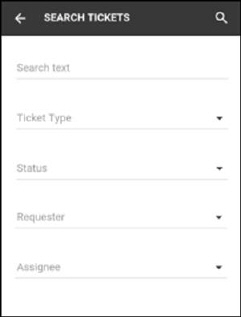 Tap on the Search Ticket menu item in the Tickets Main page will open the Search Ticket screen. Search will be performed on Subject field of tickets. You should enter text to search, and/or select additional search criteria (filters) if needed. Search can be filtered by the following properties: •Ticket Type (tap the row, select a Type in the list). •Status (tap the row, select a Status in the list). •Requester (tap the row, start typing the name of Requester, a list is shown with names covered by the search, select a Requester in the list). •Assignee (tap the row, select a Group or a single Assignee in the list). |