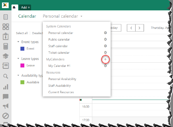 To create your private calendar, click on the “+” button next to the “My calendars” item in calendar menu.