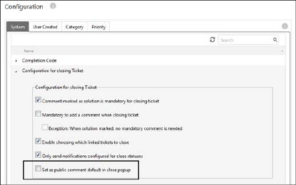 Set as public comment default in close popup: When Agent close ticket that not have a mandatory comment (e g a solution comment) a popup is opened where Agent can submit the mandatory comment. If this checkbox is enabled the popup comment is marked as Public by default, otherwise it is marked as Internal.