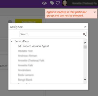 Ticket detail form, Assignee field. In popup to select an Assignee users that have been removed from the Group is marked with a (x) in front of the name. This user cannot be selected as new Assignee (you will get an error message when you try to save the ticket).