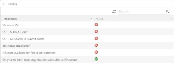 Only users from own organization selectable as Requester: This option filters the selectable options so users connected to the role can only select users belonging to the same organization as Requester of a ticket. Other users are not selectable and not visible in dropdown or popup.