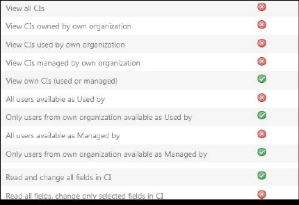 View CIs managed by own organization: Only CIs where property Managed by value is a user belonging to the same organization as the current user is displayed in the list.