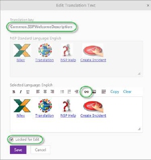 Go to the Translation manager and open the translation tab. Search for the language tag key “Common.SSPWelcomeDescription”. Open for edit an put in images and links as you please. It will present on the web page pretty much exactly as is shown when you edit. Note! Do not forget to mark the Locked for import checkbox before saving. This makes sure that you keep your customization on any system upgrade. |