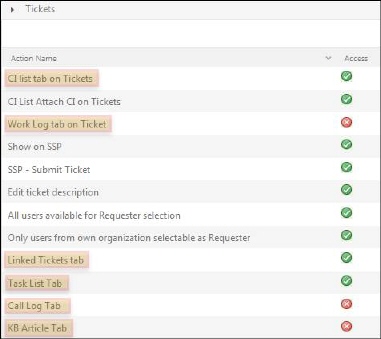 For a role you can enable/disable access to different tabs in ticket form. Select Entity Actions tab, Tickets section. Here you can manage access to the tabs in ticket form: