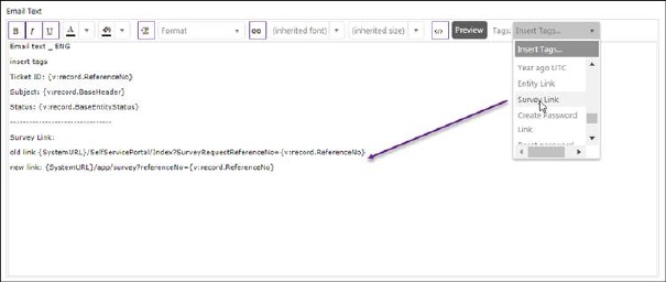 In Survey Settings, remove the old link and select tag Survey link to replace it: