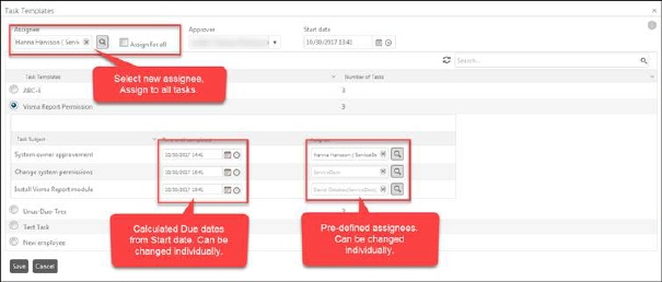 •If other assignee shall be assigned all tasks in the template, select assignee Name (or Group) and enable checkbox Assign for all before saving.