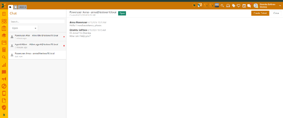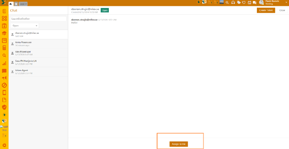Clicking the chat icon opens a chat window with conversation list on the left and conversation content on the right. Given the messages in the agent portal are received by all agents, you need to assign conversation to yourself, if you want to take over the request.
