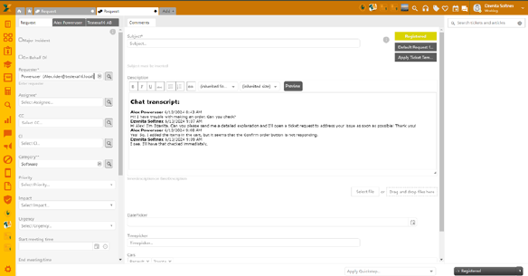 The ticket issue can be further handled in a regular ticket procedure or discussed in the chat if the conversation is open.