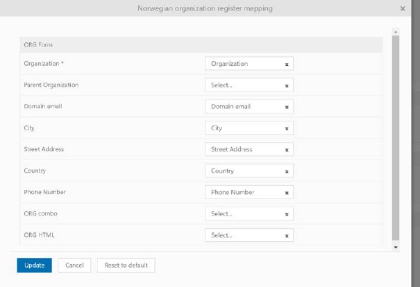 The function allows directly searching through all organizations registered on the territory of Norway. By selecting the required organization, all fields from the Norwegian organization register can be mapped within the internal organization entity on the NSP. You need initially to enable functionality to be able to map. In case you do not select the values for mapping, there is a default mapping set.