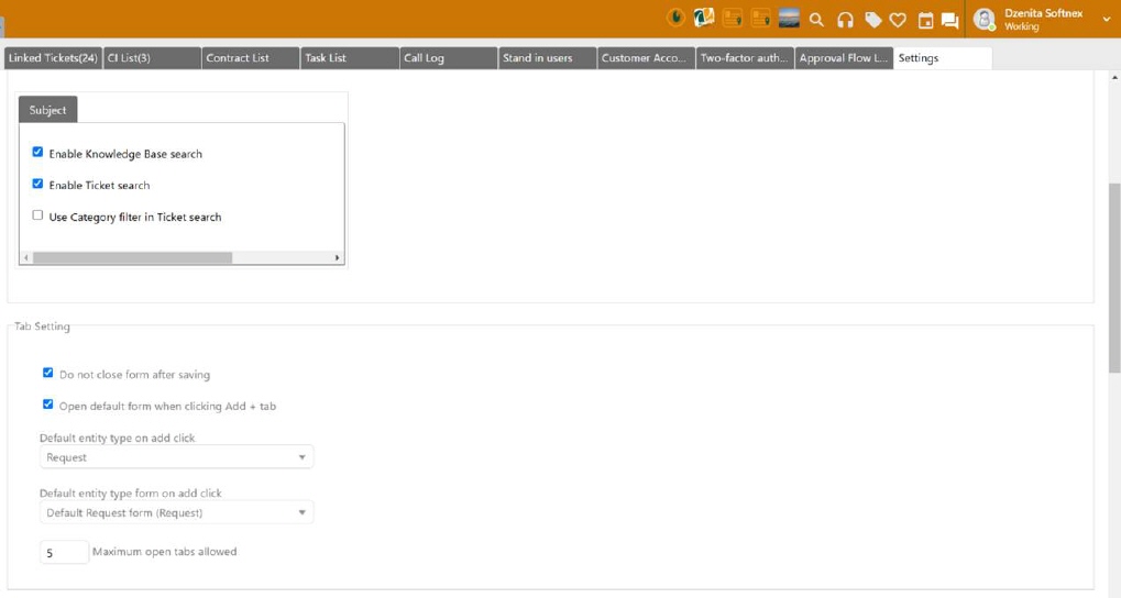 Agent User Profile - Settings: Each agent can select a default entity and associated default form when creating a new ticket by clicking Add + in top menu of the agent portal. |