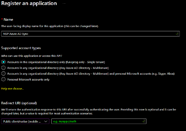 account type and Redirect URI as shown above. Do not type in the text box for