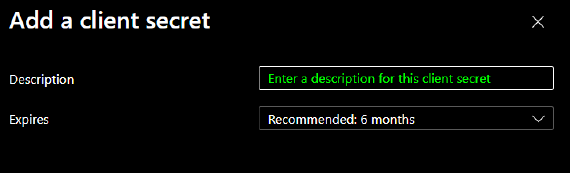 Add a description, and choose how long "client secret" should be valid, and click Add.