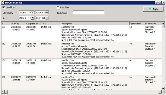 Each time a scheduled scan/install is run, a report is created that stores successful, failed and skipped installation attempts. To view the reports, go to menu Inventory Service > Server scan log.