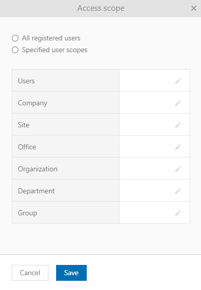 If you want to grant access rights to all users in the system, select the All registered users option. In case you want to allow access only to certain users, select the option Specified user scopes and then specify in the list below which objects have the right of access.