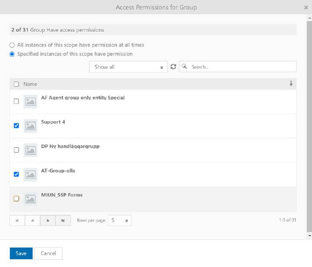 Specified instances of this scope have permission – this option allows us to choose a specific instance within a scope which will get access permission. For example, if we are configuring access permission for organizations, and with this option we select the organization Nilex from the offered list, only that organization will get the right of access, including groups and users who are members of the same.