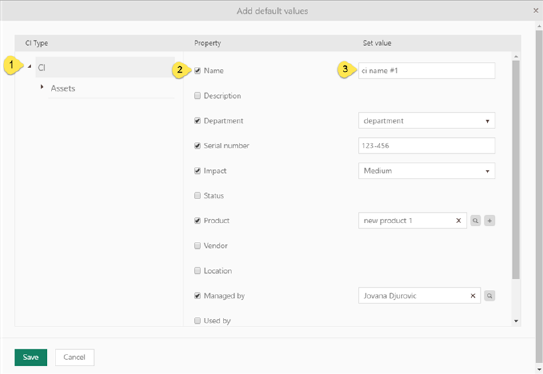 Form has two parts. In the left panel there is the tree list with all the CI types. Use arrows (1) to expand/collapse Ci Type and click on CI type for which you want to predefine properties default value. Due to selected type list of properties is changed. List display properties associated with chosen type.