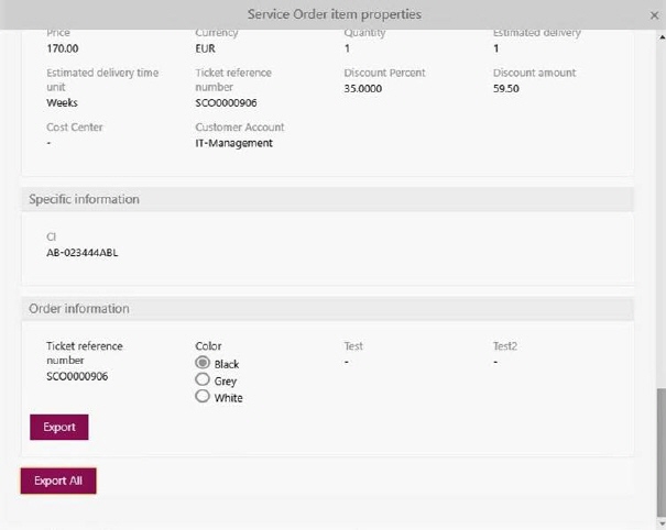 A Service Request ticket contains a standard Description with a list of order properties. If your system uses multiple languages, note that the ticket Subject and Description is always inserted in the requester´s language. In the bottom of the description there is a link, View order details. This link opens a popup showing order information in agent´s language. At the bottom of this popup, there is a button Export, within order information box. This button enables exporting order details in PDF format, but only basic order details that requester filled in ( for example color of an item etc.). Another button below, Export All will make PDF document with all information regarding specific order (all fields from service item and service order, product descriptions as well as fields filled in by requester).