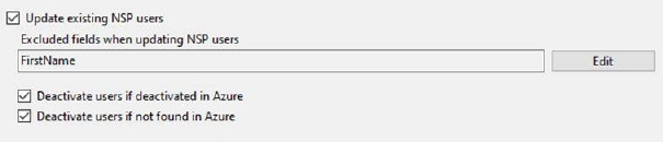 Check the appropriate boxes to enable updating NSP users and to deactivate them when deactivated in Azure or not found in the mapped Azure group. It is also possible to exclude fields from being updated.