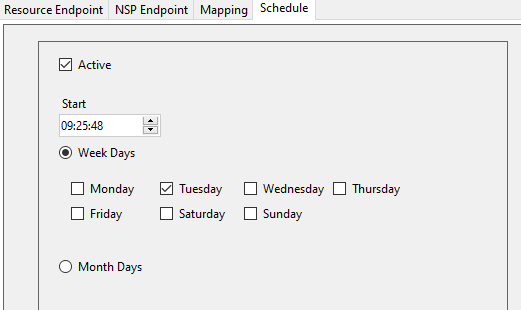 Click tab “Schedule” and click “Active”. Select start-time and week days for the user import to NSP: