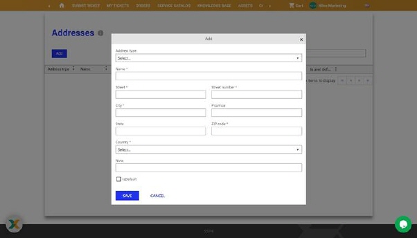 Clicking on the menu addresses opens a list with all the addresses of the selected user as well as all his customer accounts. You can add an address by clicking on the Add button, which opens a pop-up with the possibility of selecting the type of address (invoice address, delivery address, correspondent, office or home), as well as fields for entering address details. A customer account can have an unlimited number of addresses entered, but only one default address for each type of address. User can only change his own addresses but not addresses belonging to his customer accounts.