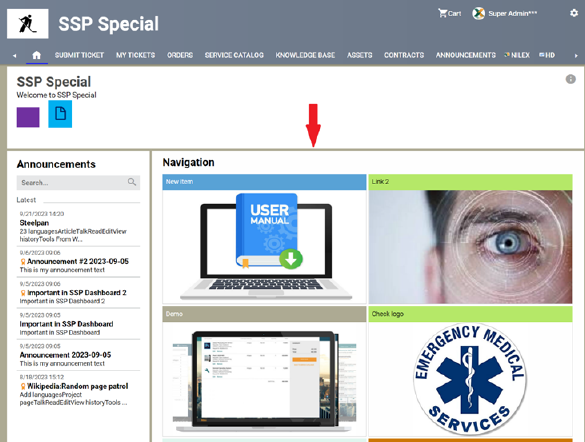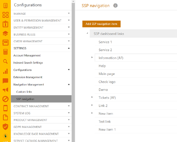 This feature enables administrators to customize the appearance, content, and user restrictions to the NSP Self Service Portal by adding folders, internal and external links, which will reflect on the SSP homepage navigation section.
