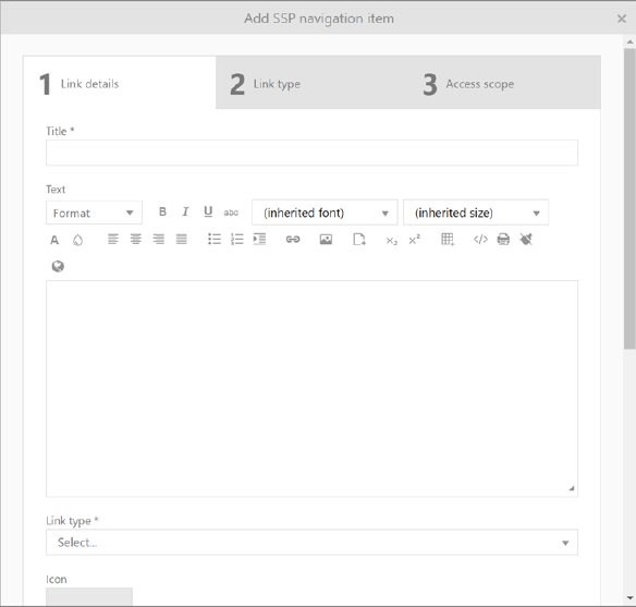 Clicking Add SSP Navigation item opens pop-up window with 3 steps: 1) Link details, 2) Link type and 3) Access scope.