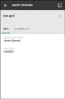 First you must choose the session that the scans will be stored upon. Tap the Take Inventory link in the CMDB Main Menu and list of your Audit Sessions with the following fields. Session Name Responsible Agent: Displays name of responsible agent Asset Inventory Name: Each session is connected to an Asset Inventory that helps to create structure among the sessions. The sessions can for instance be grouped by when the scan is made (Asset Inventory =”May 2017”) or the physical premises (Asset Inventory =”Building A,Level 2”) Start Date: Displays audit session start date. Tap the desired session and you will enter scanning session Info page. |