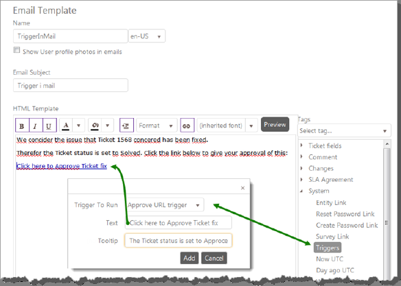 This tag inserts a HTML link into your mail template. When the recipient clicks it, the trigger that you have connected is run. This manipulates the Entity that is the origin of the Notification that has been sent. An example is a links that by clicking it, the recipient accepts a change.